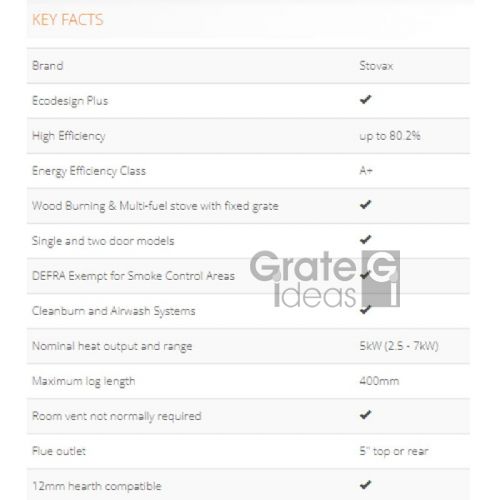 The Ecodesign Stovax Stockton 5 Wide Fixed Grate Wood Burning & Multi-fuel stove offers impressive flame visuals with its landscape burn chamber and expansive viewing window. 5kW of heat output makes this versatile stove suitable for a wide range of rooms, and with its wide front and narrow depth, plus a choice of single or double doors, it presents you with an additional option to the popular Stockton 5.